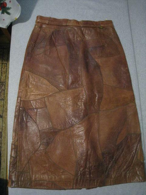 Sprzedam widoczną na zdjęciach spódnicę skórzaną z łatek. Kolor brązowy, Długość spódnicy 70 cm. Szerokość w pasie 70 cm.